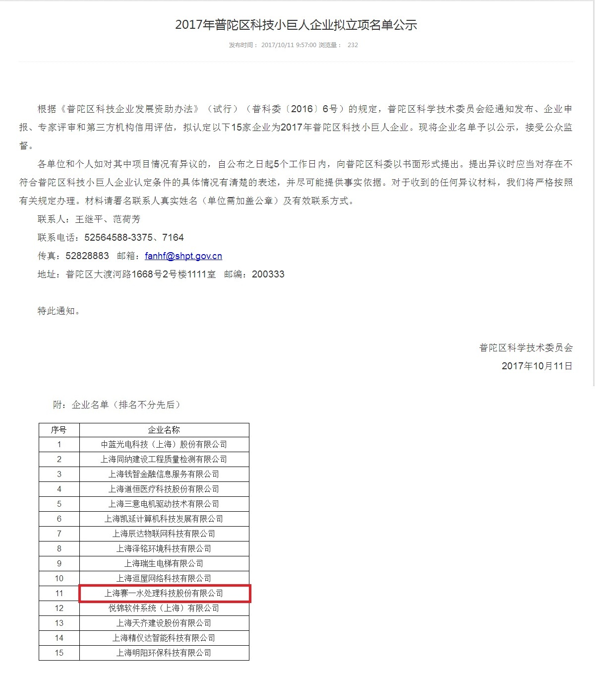 近日,2017年普陀区科技小巨人企业拟立项名单揭晓,我司通过上海市普陀区科学技术委员会专家组评审及第三方机构信用评估,成功获得申报。