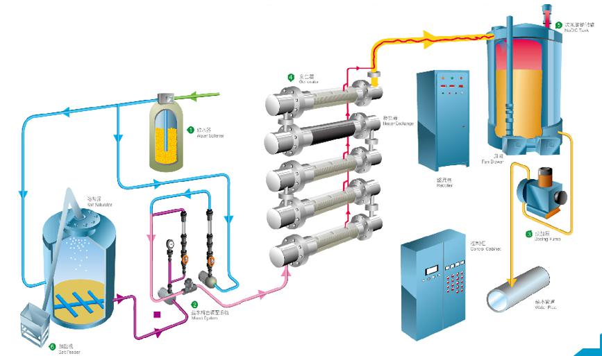 该设备由进水模块、溶盐模块、发生模块、储存及排氢模块、投加模块及控制模块组成。