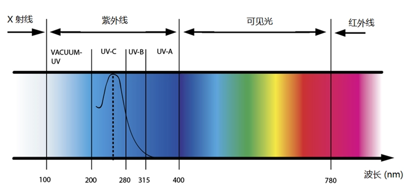 紫外线消毒应用波长225~275nm,其中以253.7nm波长的消毒能力最强,当水或空气中的各种细菌病毒经过紫外线照射区域时,紫外线穿透微生物的细胞膜和细胞核,破坏微生物原体的核酸(DNA和RNA),从而阻止它们合成蛋白质和细胞分裂,使微生物原体不能够复制、不能遗传而终死亡。